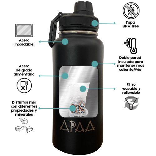 - AGUA ALCALINA FRÍA por varias horas: Con la nueva botella APAA Equipé puedes hacer y tomar agua alcalina donde tú quieras.
