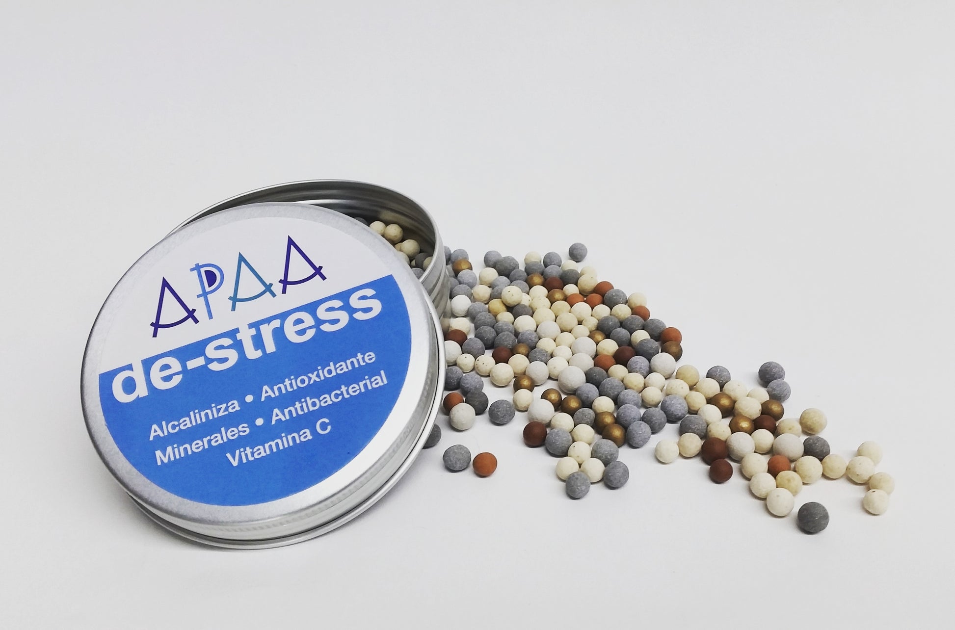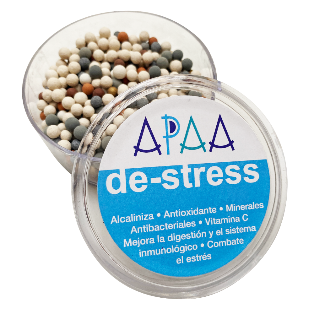 De-stress Mix contiene 6 tipos de piedras específicamente diseñadas para darle nuevas propiedades a tu agua todos los días. Solo agrega agua potable en tu botella APAA y las piedras transferirán sus propiedades.